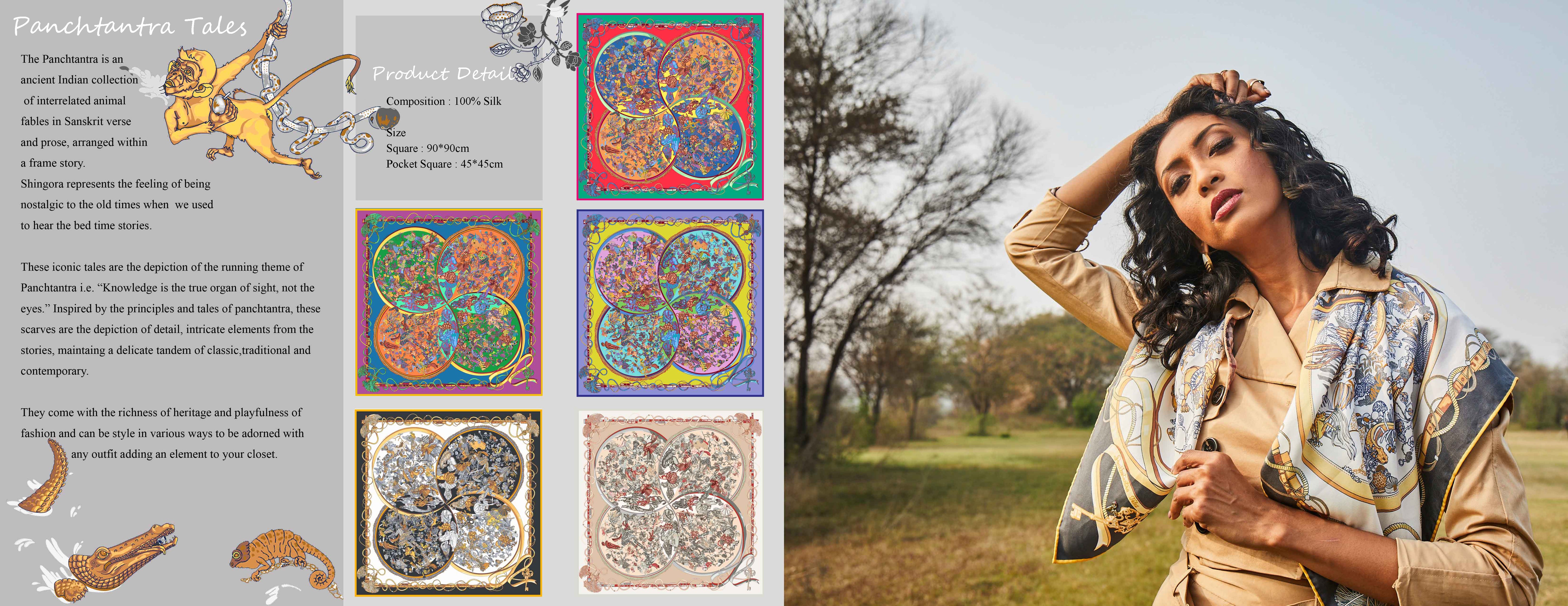 These luxurious silk scarves beautifully translate the magic of storytelling into intricate, illustrative designs. Each piece captures the spirit of these ancient tales, blending traditional elements with a contemporary touch.