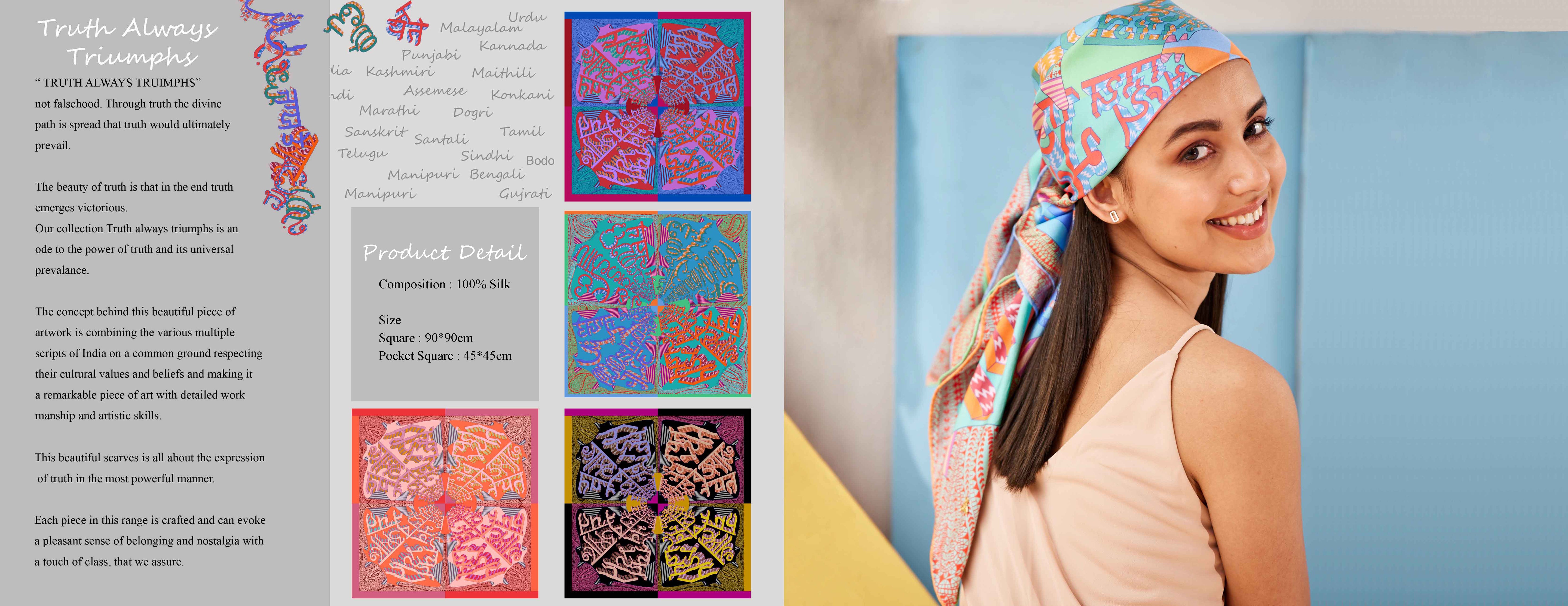 Celebrate unity through diversity with our "Truth Always Triumphs" silk scarves, beautifully crafted using scripts from across India. Each piece weaves a powerful message of truth with rich colors and traditional calligraphy—bringing culture, craftsmanship, and meaning together.