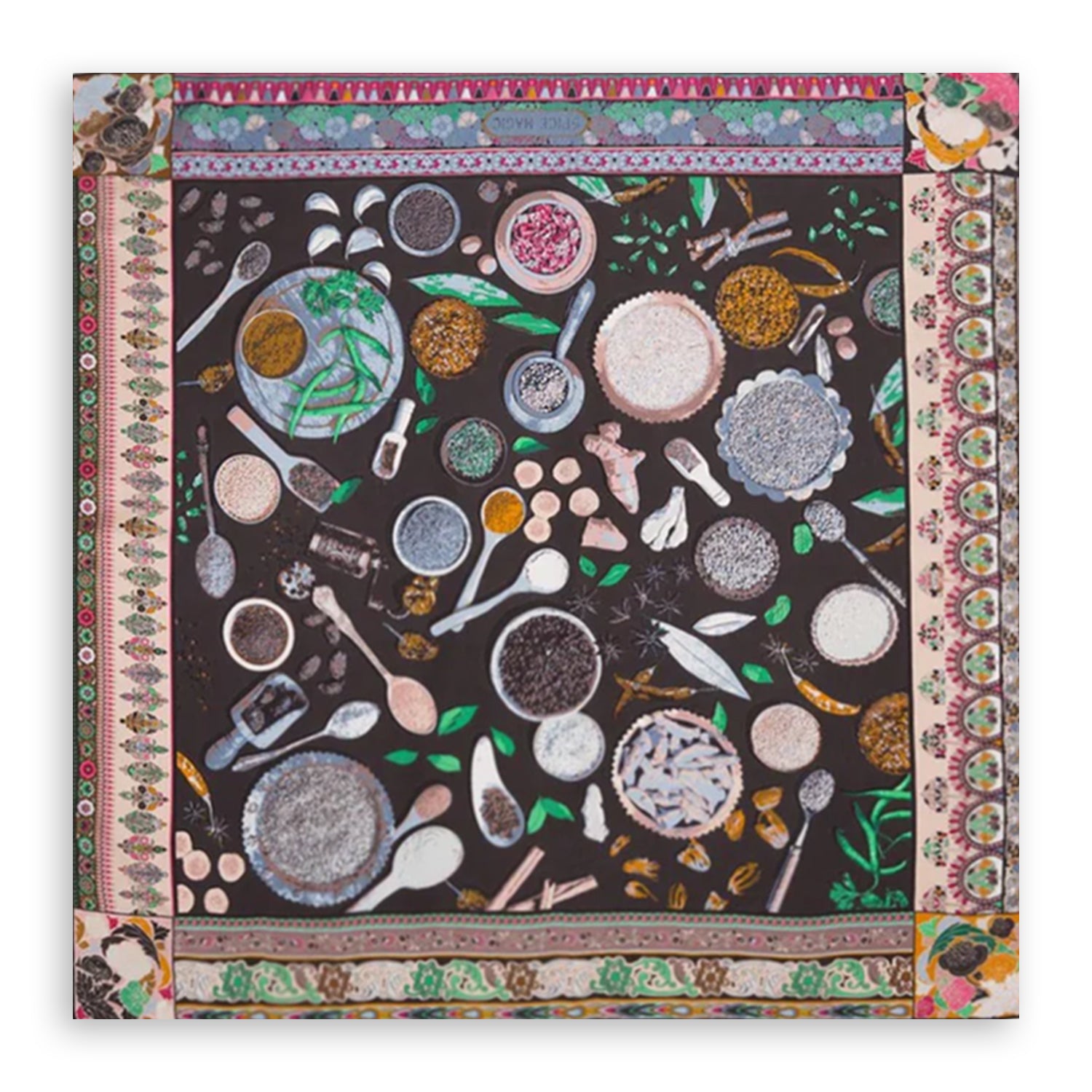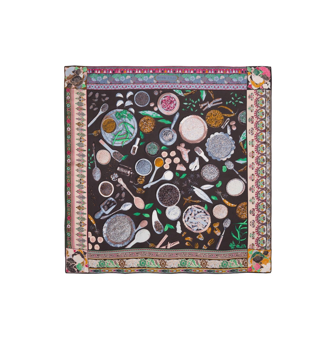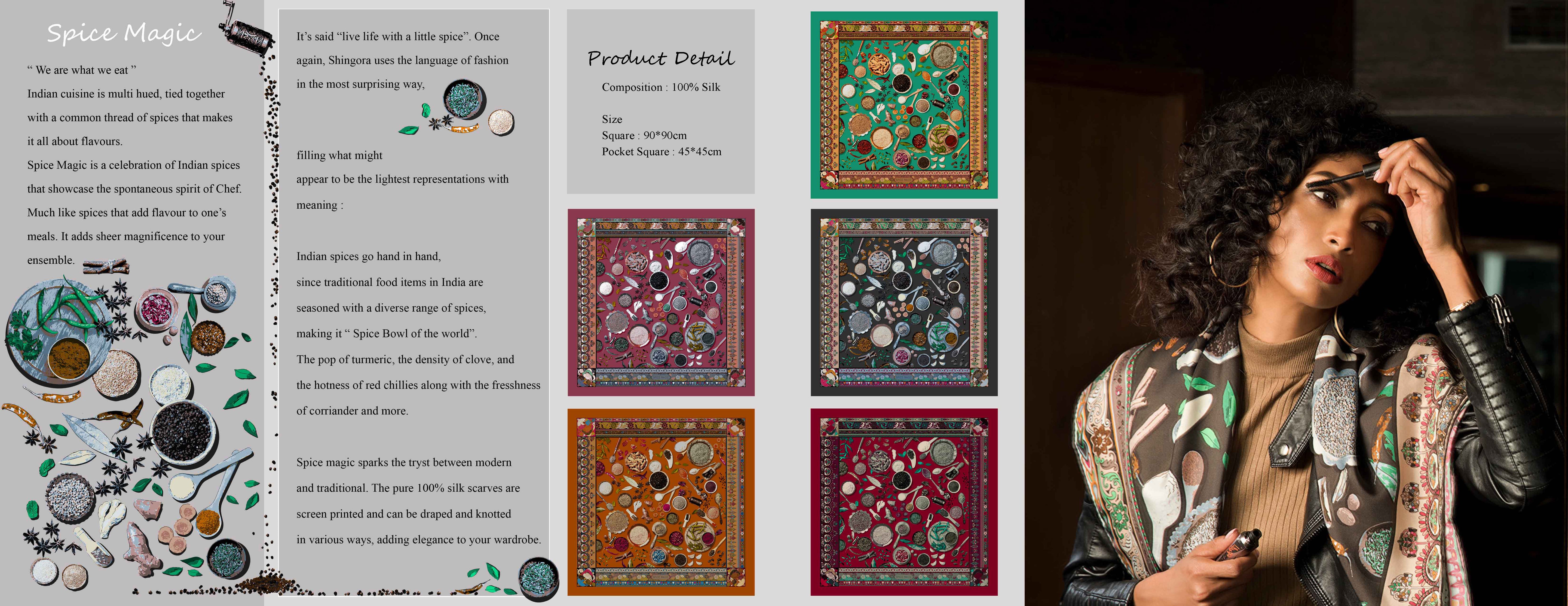 The pop of turmeric,the density of clove and the hotness of red chillies along with the freshness of coriander and more. Spice magic sparks the tryst between modern and traditional. The pure 100% silk scarves are screen printed and can be draped and knotted in various ways.